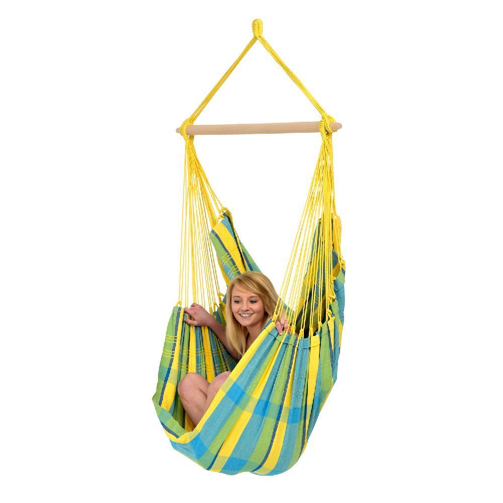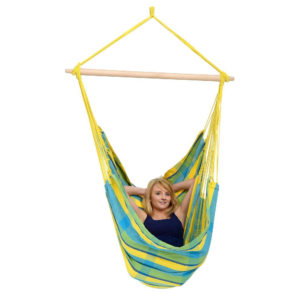 Ten fotel hamakowy tkany w Brazylii jest cudownie miły dzięki bardzo wysokiej zawartości bawełny w składzie: 85% bawełny i 15% poliestru.