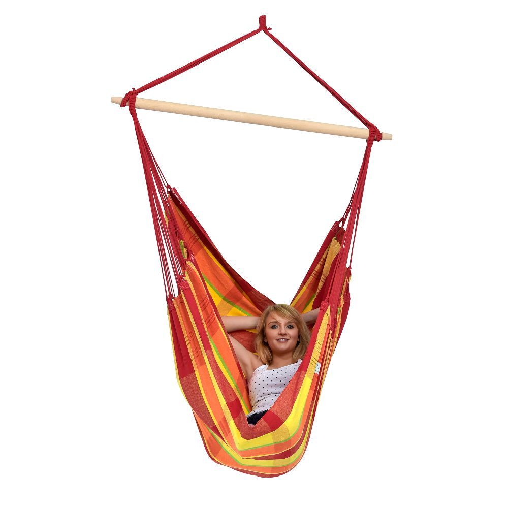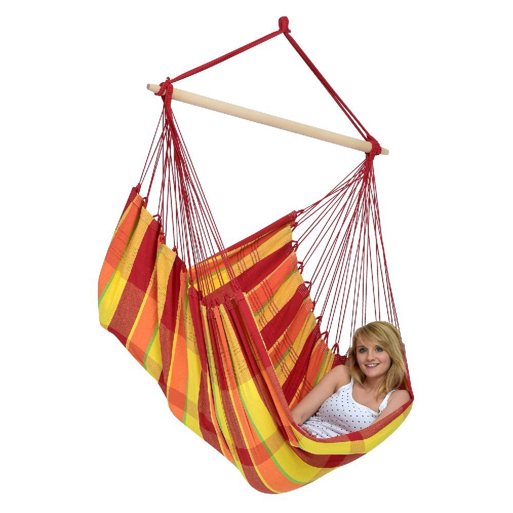 Ten fotel hamakowy tkany w Brazylii jest cudownie miły dzięki bardzo wysokiej zawartości bawełny w składzie: 85% bawełny i 15% poliestru.