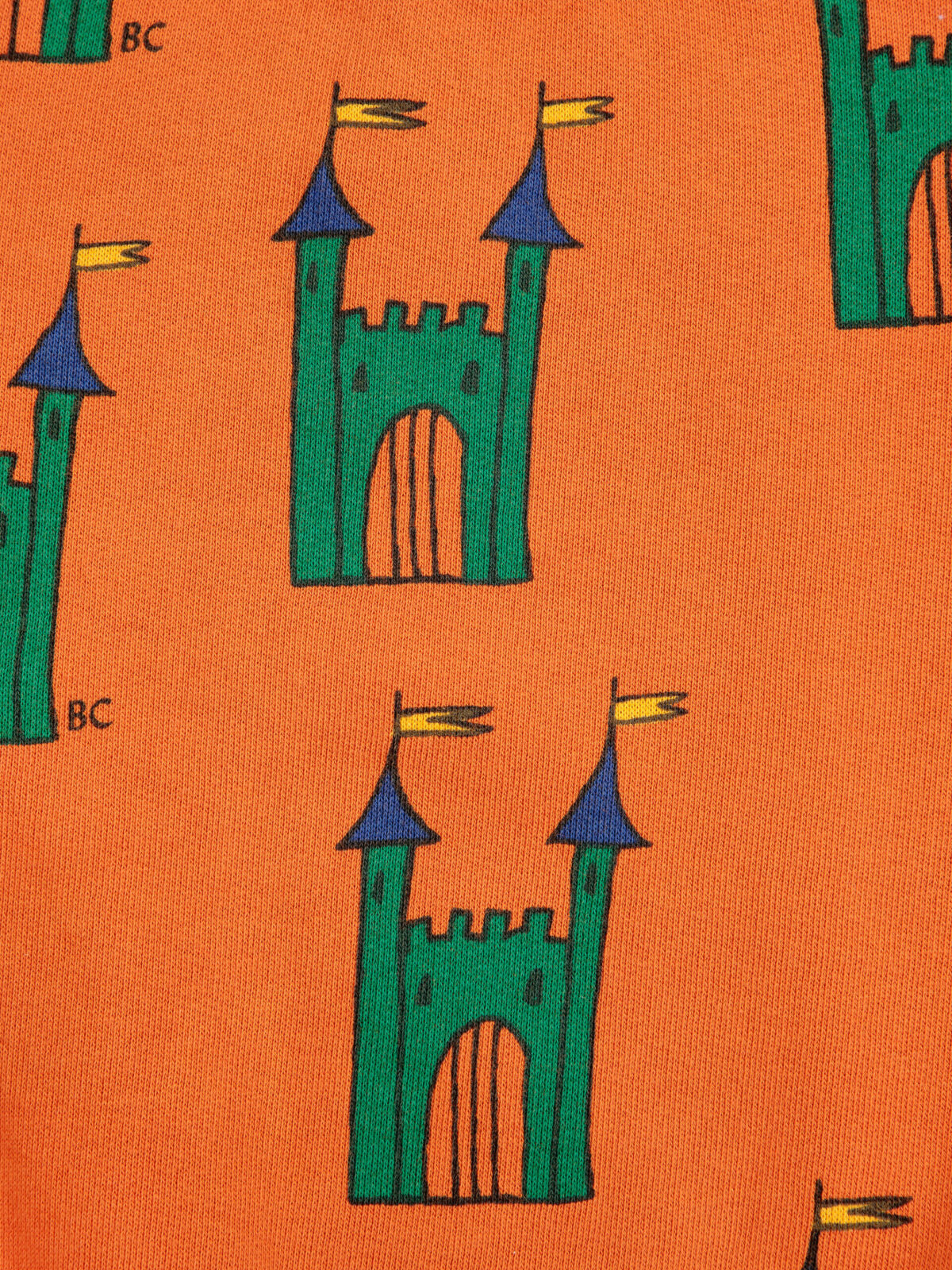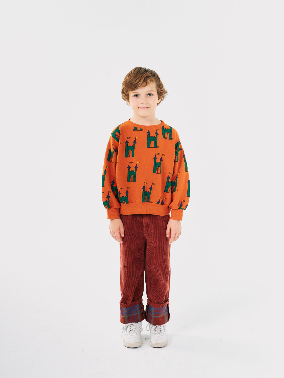 Bawełniana bluza od hiszpańskiej marki Bobo choses. Bluza jest w kolorze pomarańczowym i ma na całej powierzchni nadruk w zielone zameczki.
