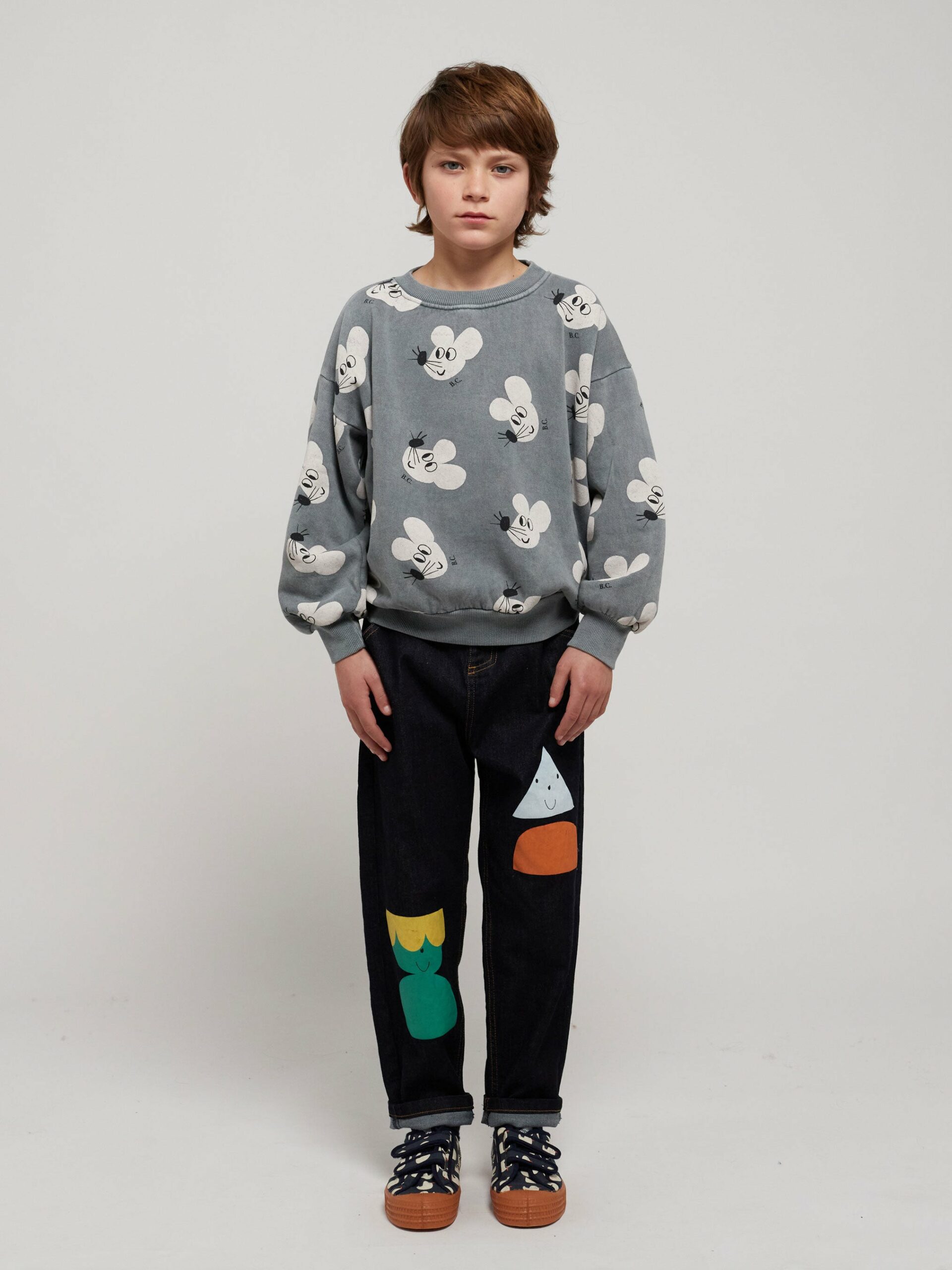 Spodnie o luźnym kroju hiszpańskiej marki Bobo Choses w kolorze grafitowym z kolorowymi nadrukami.