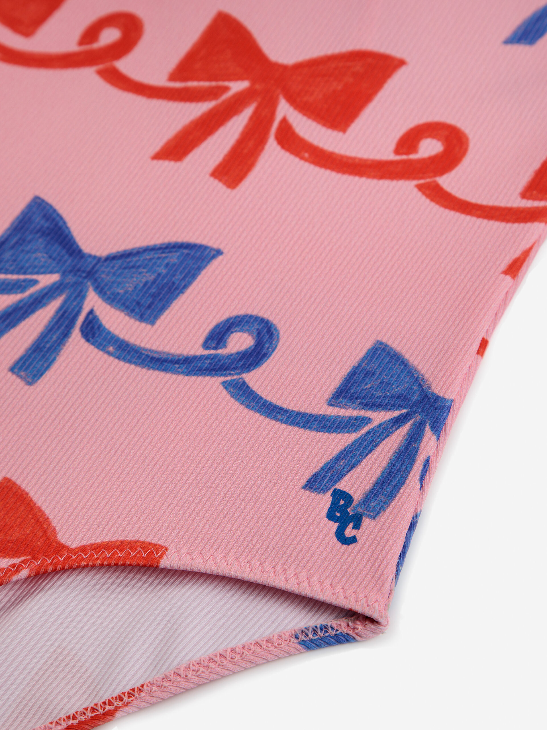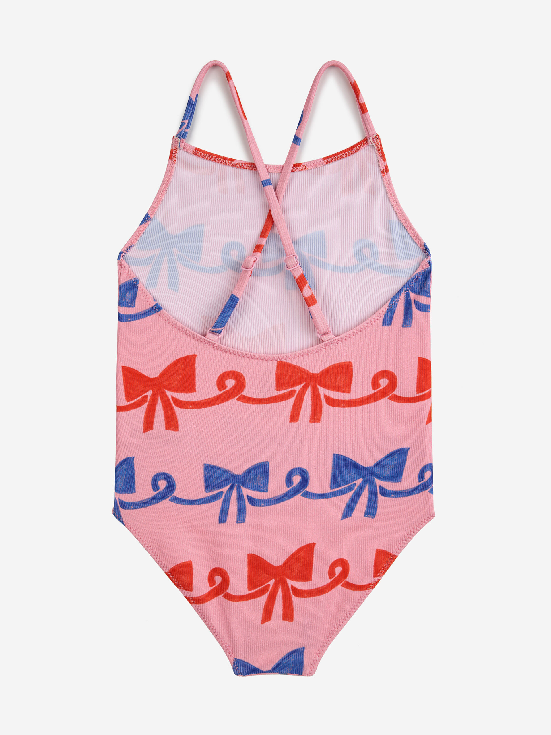 Różowy kostium kąpielowy z nadrukiem w czerwone i granatowe kokardki od hiszpańskiej marki Bobo choses.