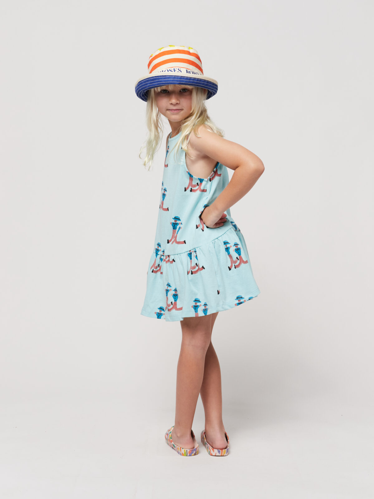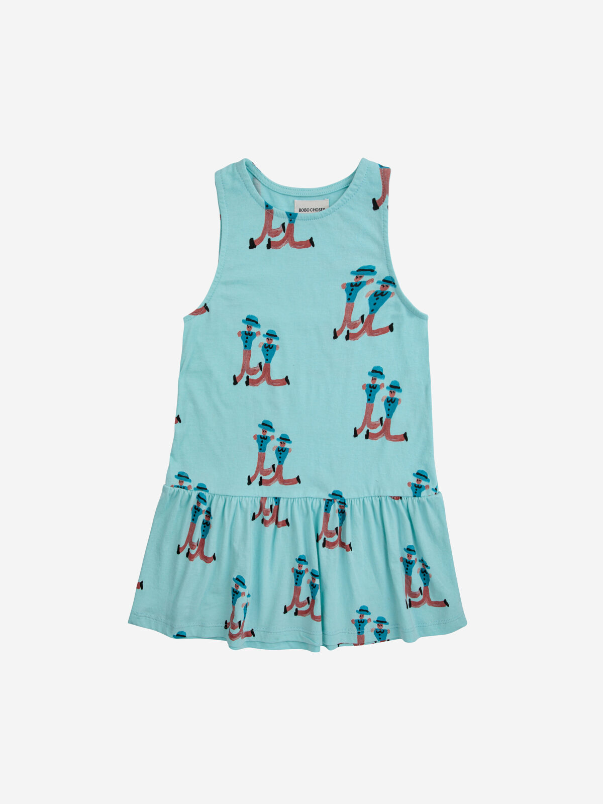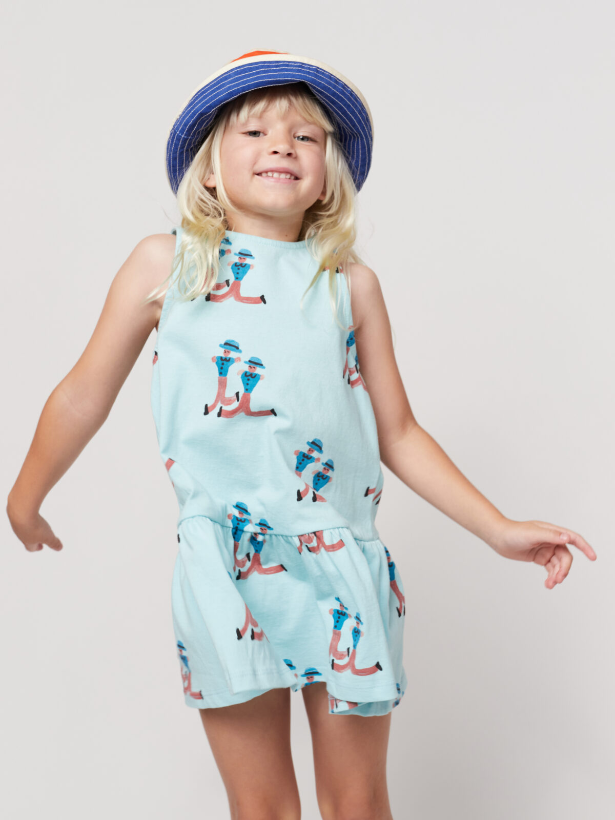 Sukienka na ramiączka od hiszpańskiej marki Bobo Choses w kolorze niebieskim z motywem tańczących ludzików.