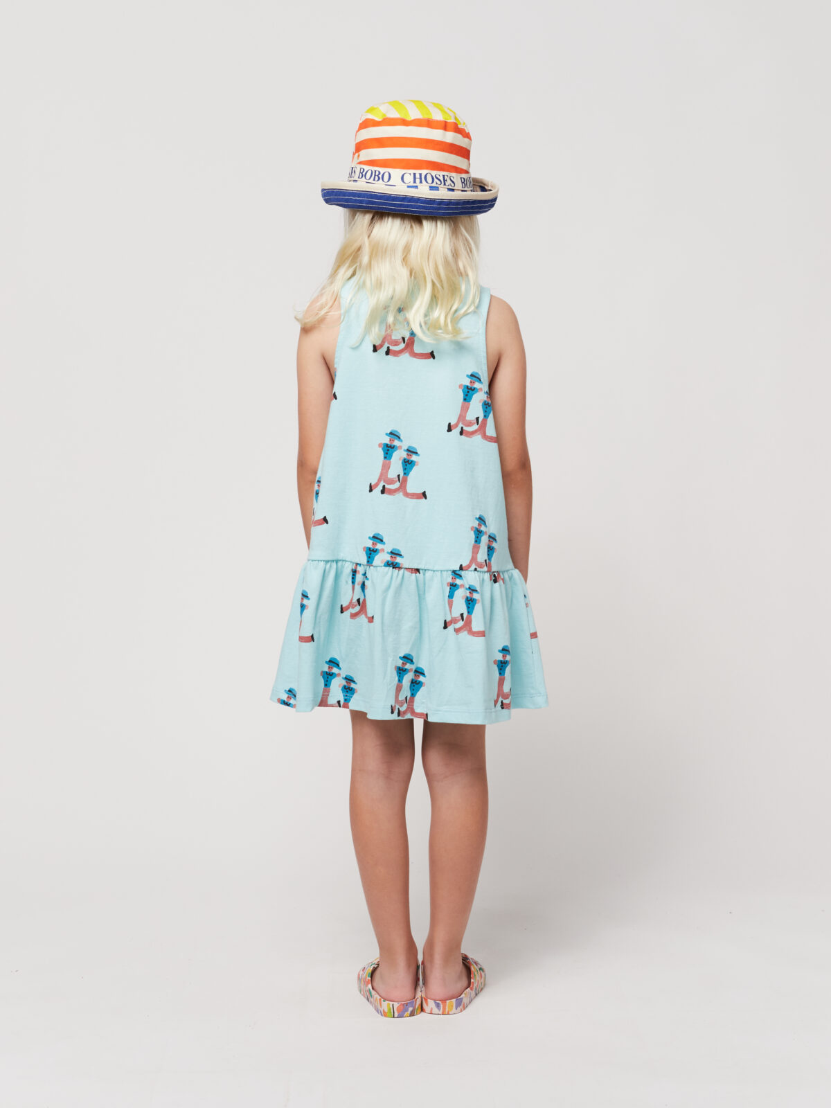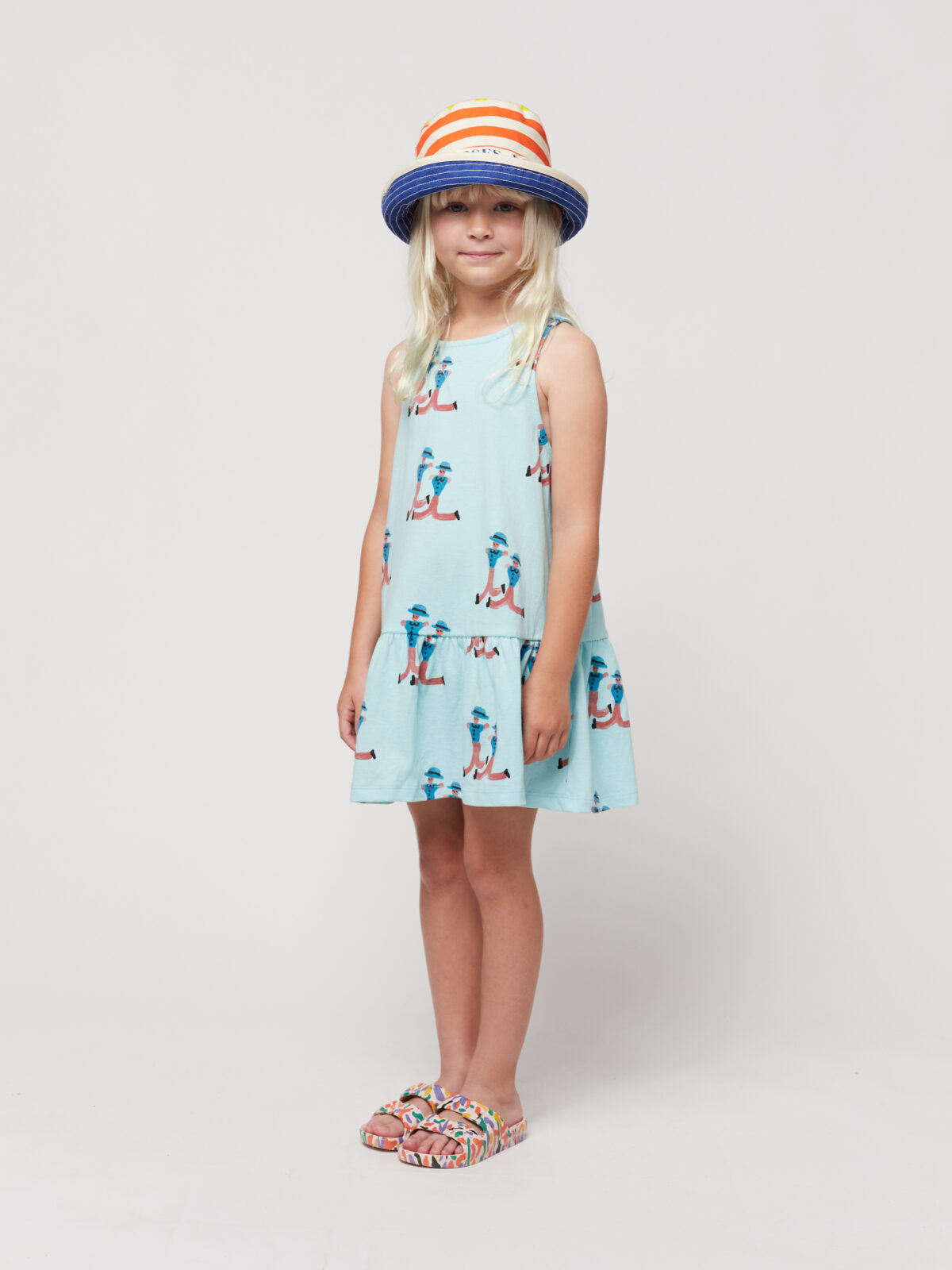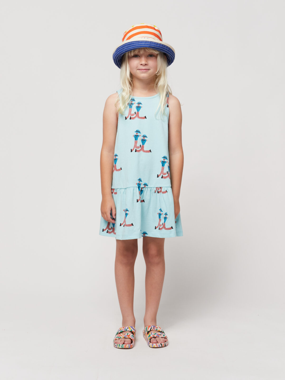 Sukienka na ramiączka od hiszpańskiej marki Bobo Choses w kolorze niebieskim z motywem tańczących ludzików.