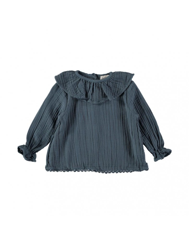 Ciemnoniebieska bluzka z kołnierzykiem zapinana z tyłu na guziki.