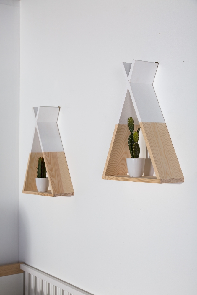 Drewniana półka do modnego pokoju dziecięcego. Półka ma biały akcent, który nadaje mu niepowtarzalny wygląd tipi.