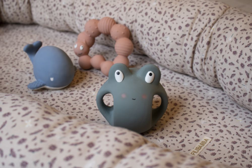 Gryzak w kształcie uroczej żabki, wykonany ręcznie z naturalnej gumy. Idealnie sprawdzi się przy ząbkowaniu i przyniesie ukojenie swędzącym dziąsłom. Dzięki ergonomicznemu kształtowi z jego utrzymaniem poradzi sobie każdy maluch.