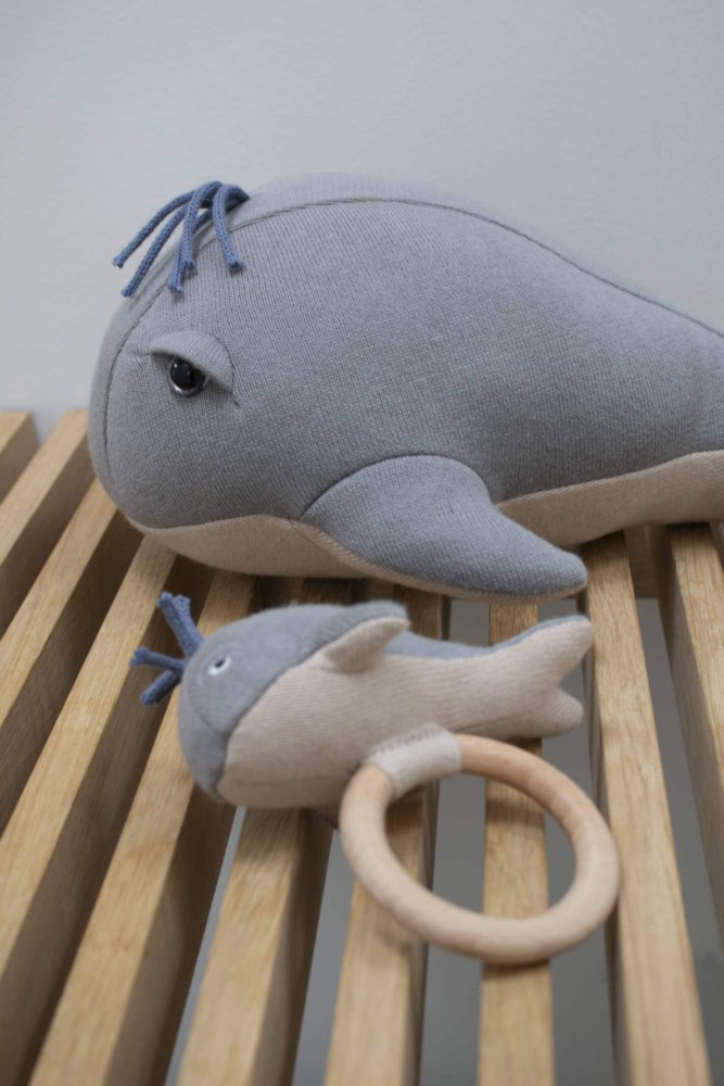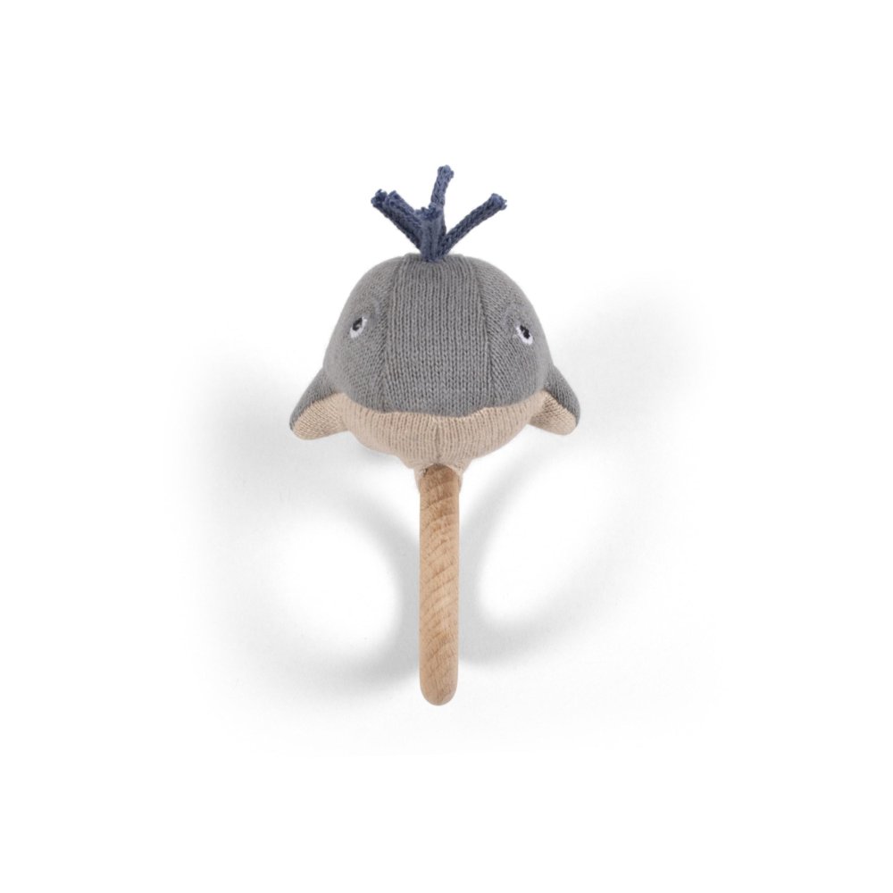 Wieloryb jest osadzony na drewnianym kółku, dzięki czemu może służyć jako grzechotka. Zapewnia dobry chwyt, nawet dla najdrobniejszych rączek.