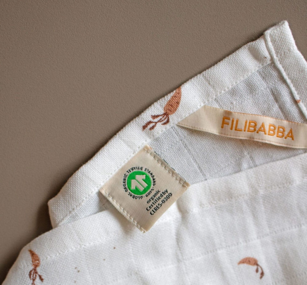 Pieluszki Filibabba wykonane są w 100% z ekologicznej bawełny, oznaczonej certyfikatem GOTS. Można je prać w pralce, w temperaturze 40 stopni, tkanina może minimalnie skurczyć się po praniu.