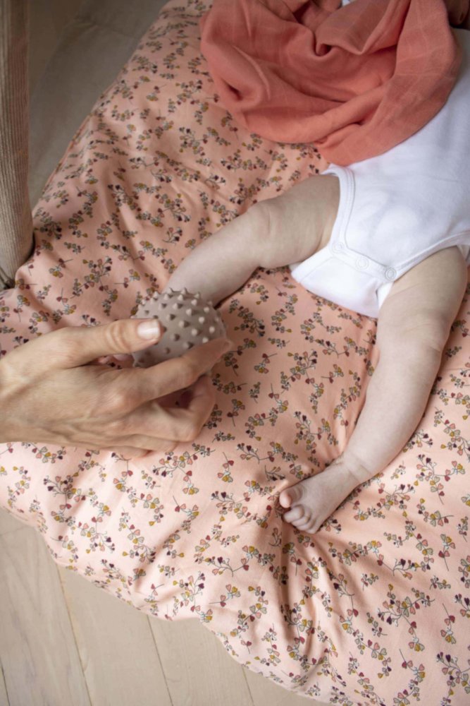 Piłka Nor została wykonana w 100% z naturalnej gumy. Pomaga stymulować zdolności motoryczne dziecka, odruch chwytania i łapania. W środku znajduje się dzwoneczek, który może pełnić też funkcję grzechotki. Dzięki mini wypustkom w kształcie kolców piłeczka sprawdzi się jako masażer, rozluźniając napięcia mięśniowe małych dzieci. To także świetna alternatywa gryzaka, zwłaszcza podczas bolesnego ząbkowania, wypustki będą w delikatny sposób masować dziąsła.