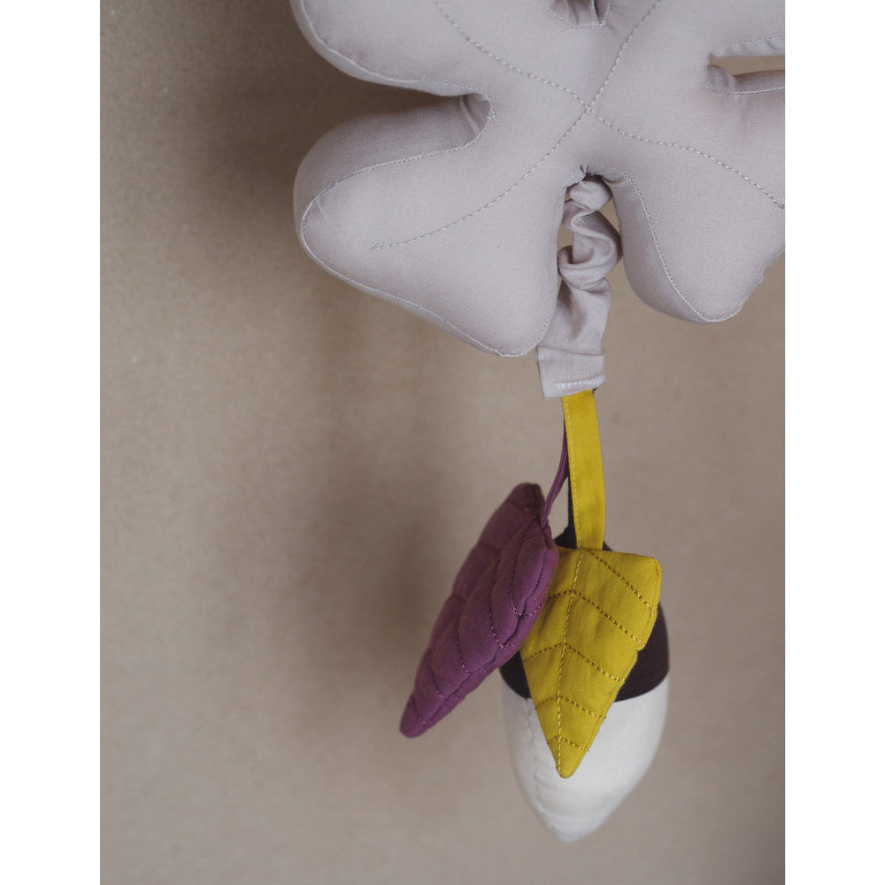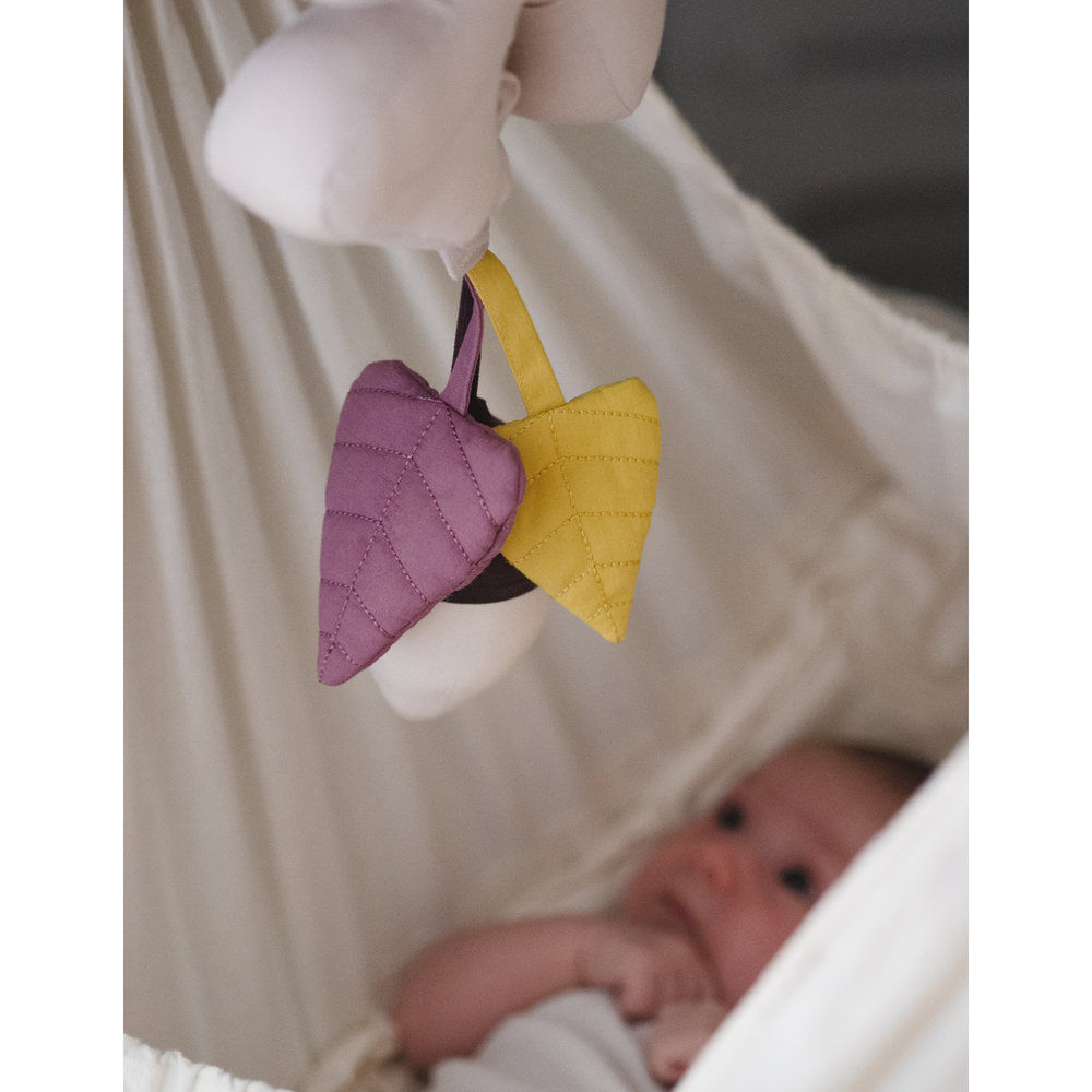 Pozytywka w kształcie liścia z szeleszczącymi elementami. Można zawiesić ją nad łóżeczkiem, w wózku, czy kołysce. Szeleszczące elementy zaciekawią maluszka, pobudzając zmysły wzroku, dotyku i słuchu, a delikatne kołysanki zapewnią spokojny sen.