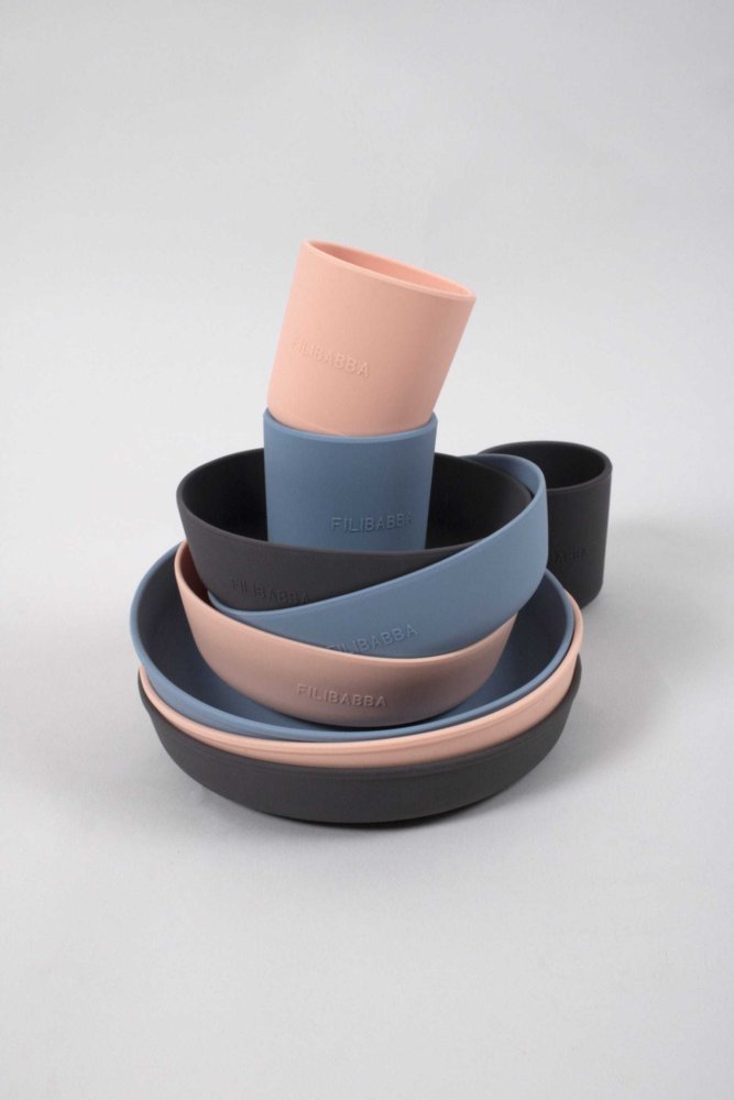 Silikonowy zestaw obiadowy składający się z talerzyka, miseczki i kubka. Miseczka i talerzyk posiadają przyssawkę pod spodem, dzięki której nie będą przesuwać się na stole czy tacce krzesełka do karmienia. Kubeczek został tak zaprojektowany by łatwo mogły go chwycić małe rączki dziecka. Zestaw sprawdzi się świetnie przy rozszerzaniu diety malucha. Minimalistyczna, stonowana kolorystyka wpasuje się w każde kuchenne wnętrze. Całość zapakowana jest w pudełko idealnie na prezent. Zestaw można myć w zmywarce.