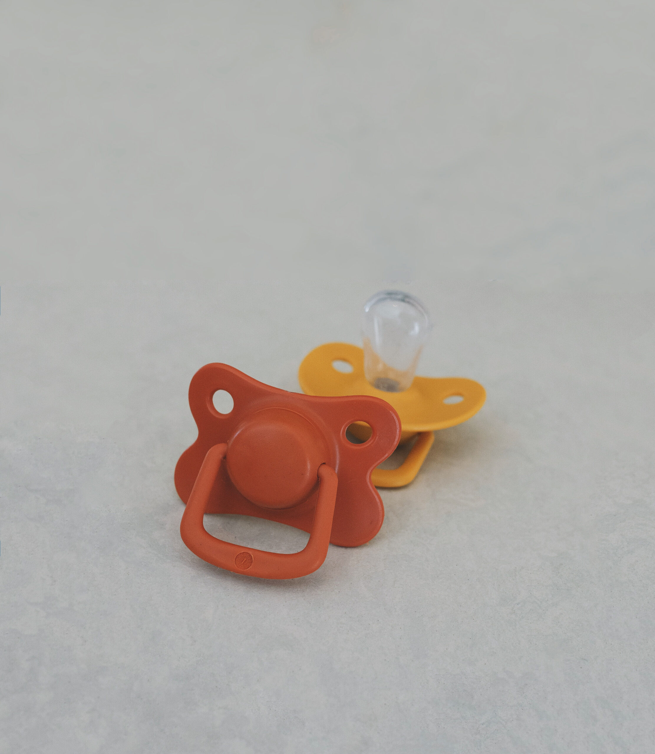Silikonowe smoczki uspokajające, zestaw 2 sztuk. W komplecie z pudełkiem, idealnym do przechowywania zapasowego smoczka. Występują w 2 rozmiarach : 0m+ i 6m+