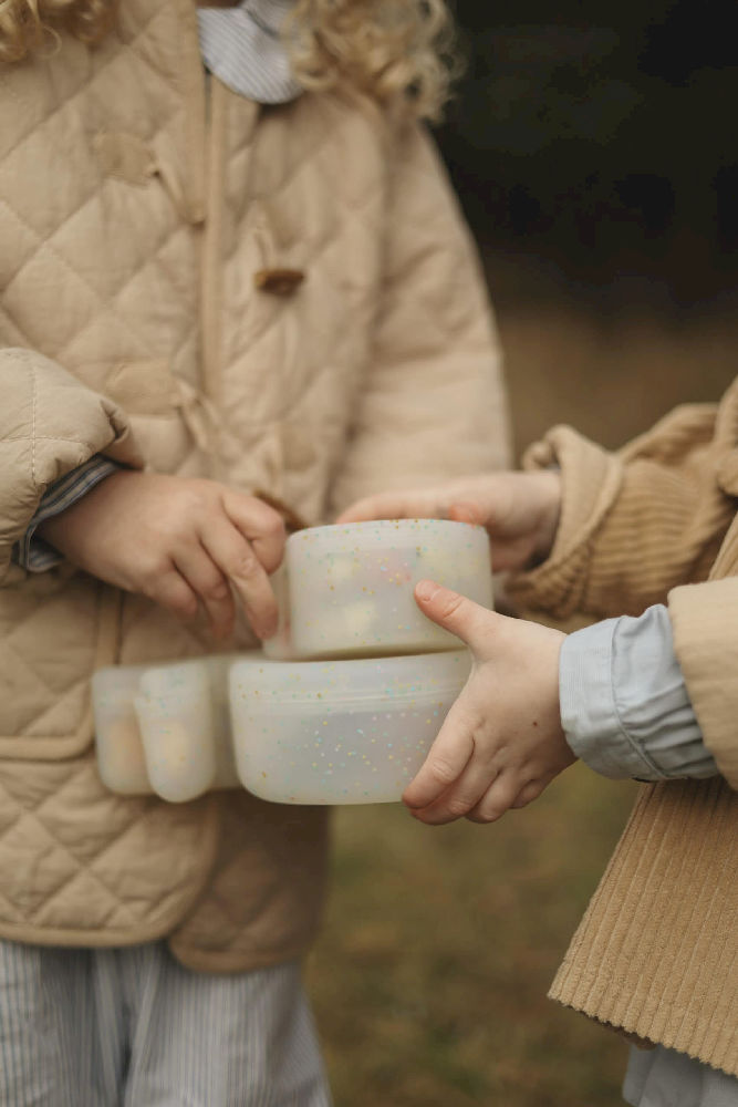 Żaden dzień na plaży nie jest kompletny bez pikniku, ponieważ dokładnie w chwili, gdy rozgościsz się na kocu, zaczynasz czuć głód. Na szczęście dorośli są dobrze przygotowani: dzięki zestawowi 2 mini pojemników na przekąski w kształcie wieloryba, wszystkie Twoje ulubione przekąski zostaną podane w mgnieniu oka. Jeśli chcesz coś zostawić na później, możesz po prostu zamknąć miseczkę wieloryba pasującą pokrywką. W ten sposób Twoje jedzenie nie będzie tak bardzo piaszczyste i dłużej zachowa świeżość. Te urocze pojemniki na przekąski mają efekt konfetti zatopiony w silikonie, dzięki czemu każdy piknik zamienia się w święto.