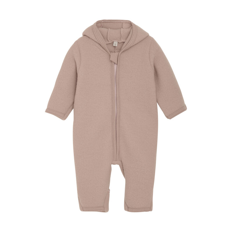 Dziecięcy kombinezon z wełny MERINO w kolorze różowym z uroczym kapturem z uszami misia.