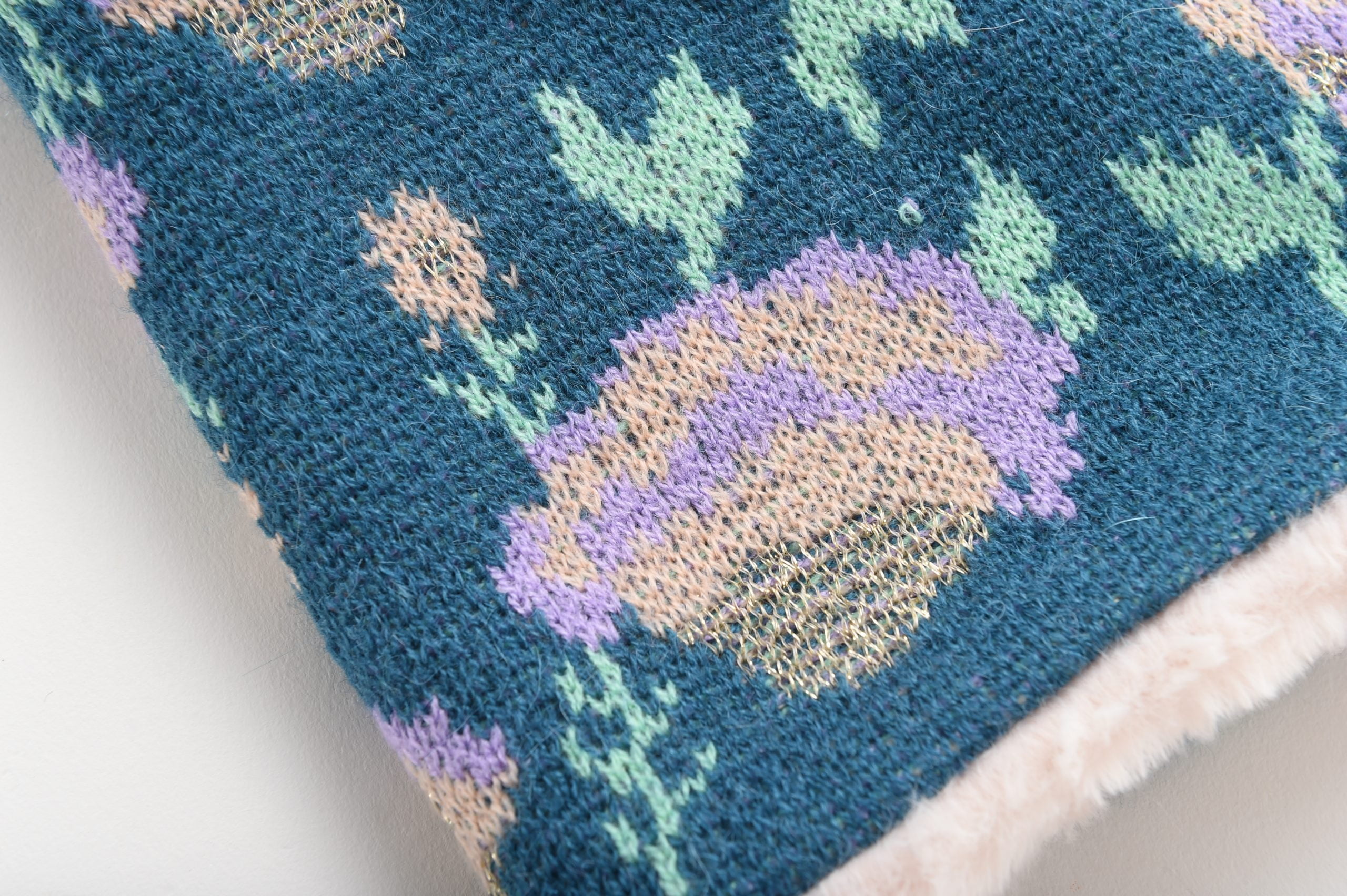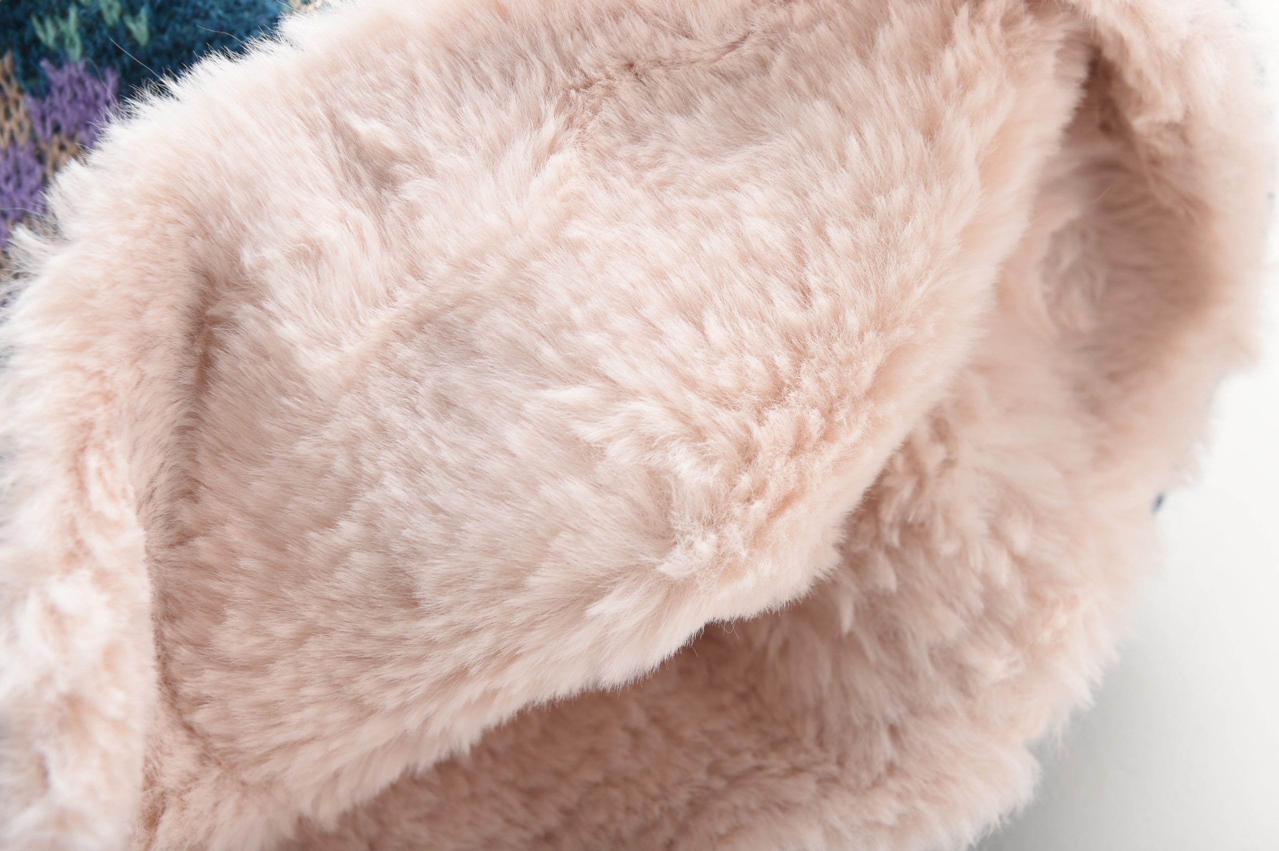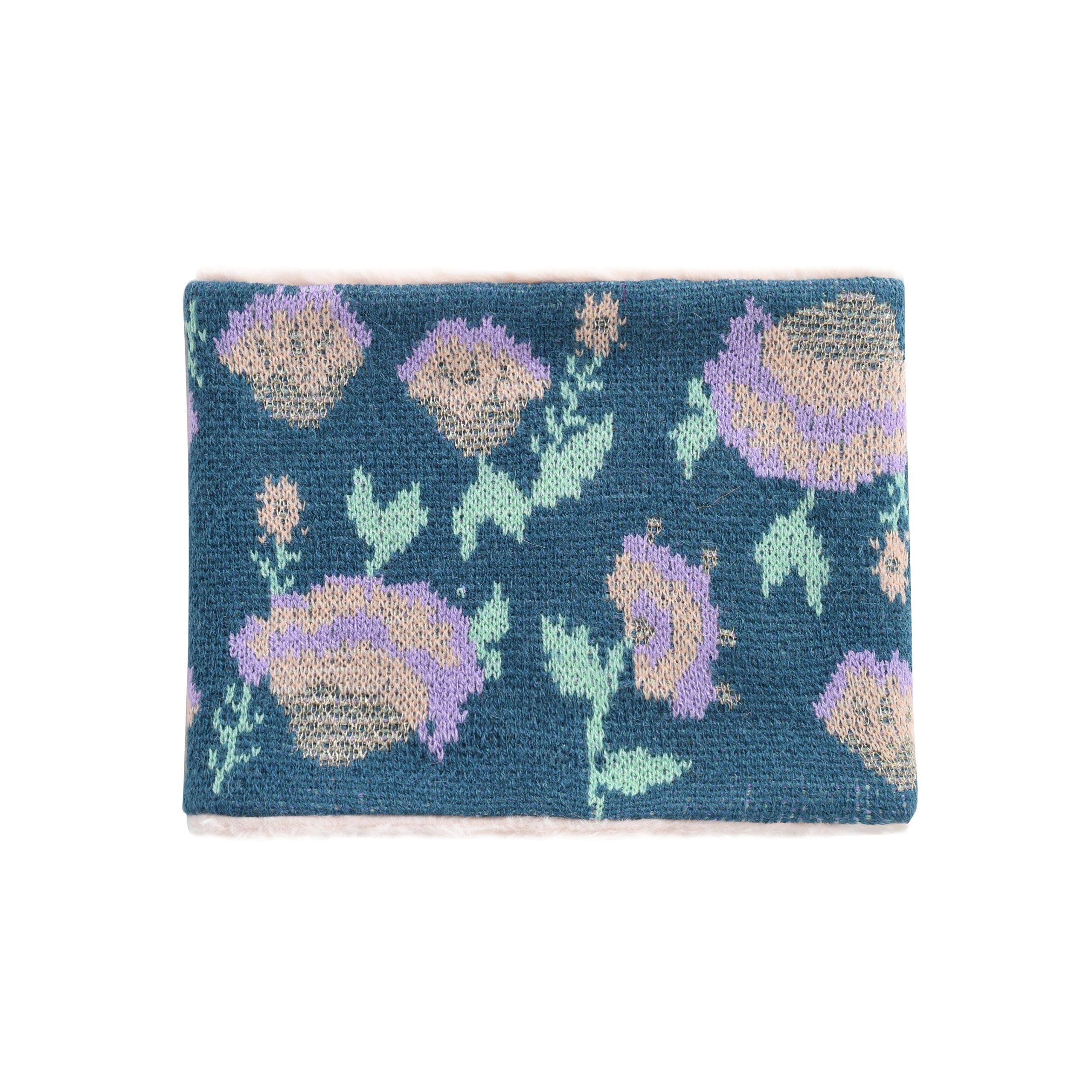 Wyszywany komin w kwiaty z różowym futerkiem w środku.
