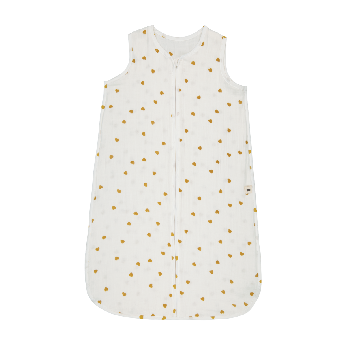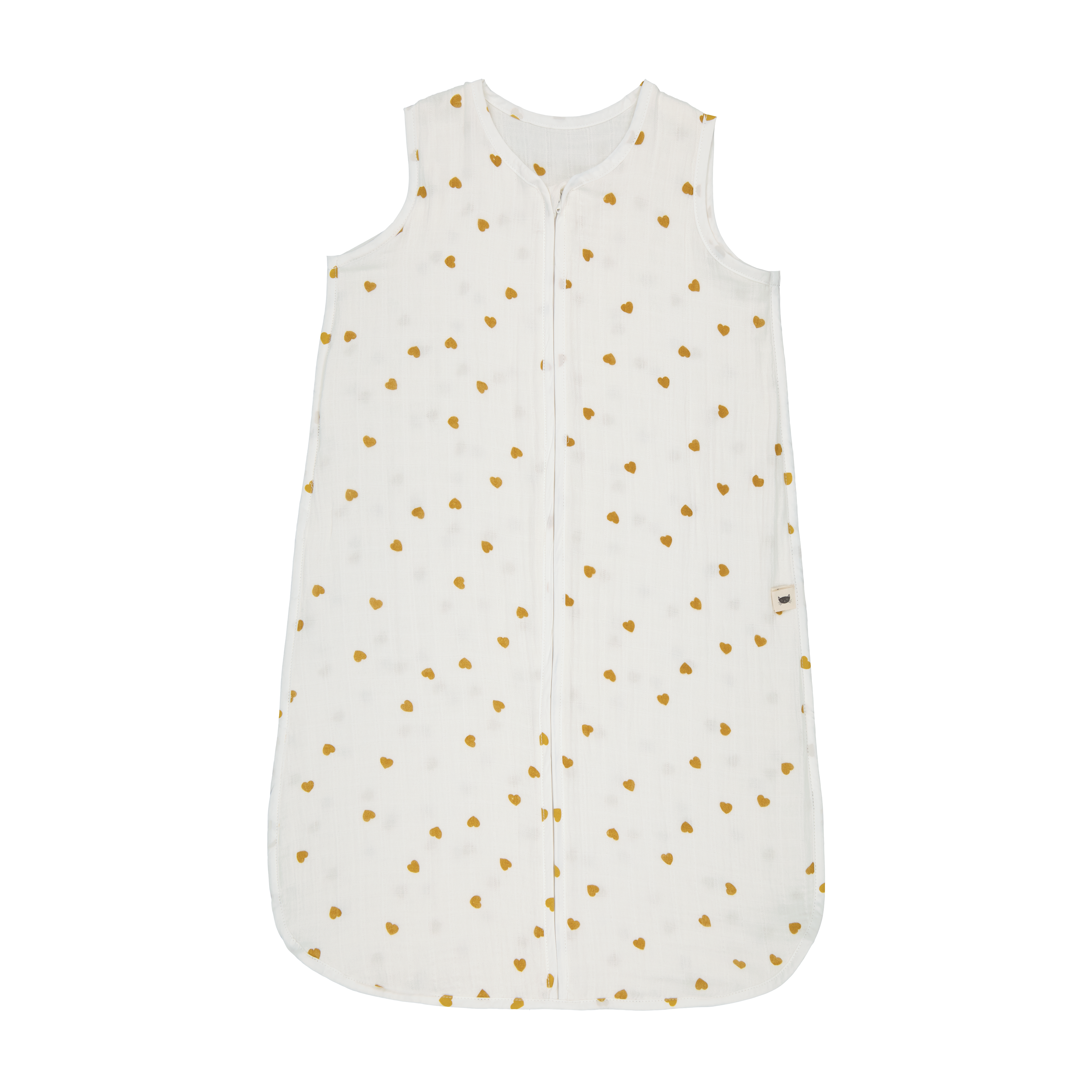 Niemowlęcy bawełniany śpiwór od francuskiej marki Rose in April w kolorze kremowym z motywem musztardowych serduszek.
