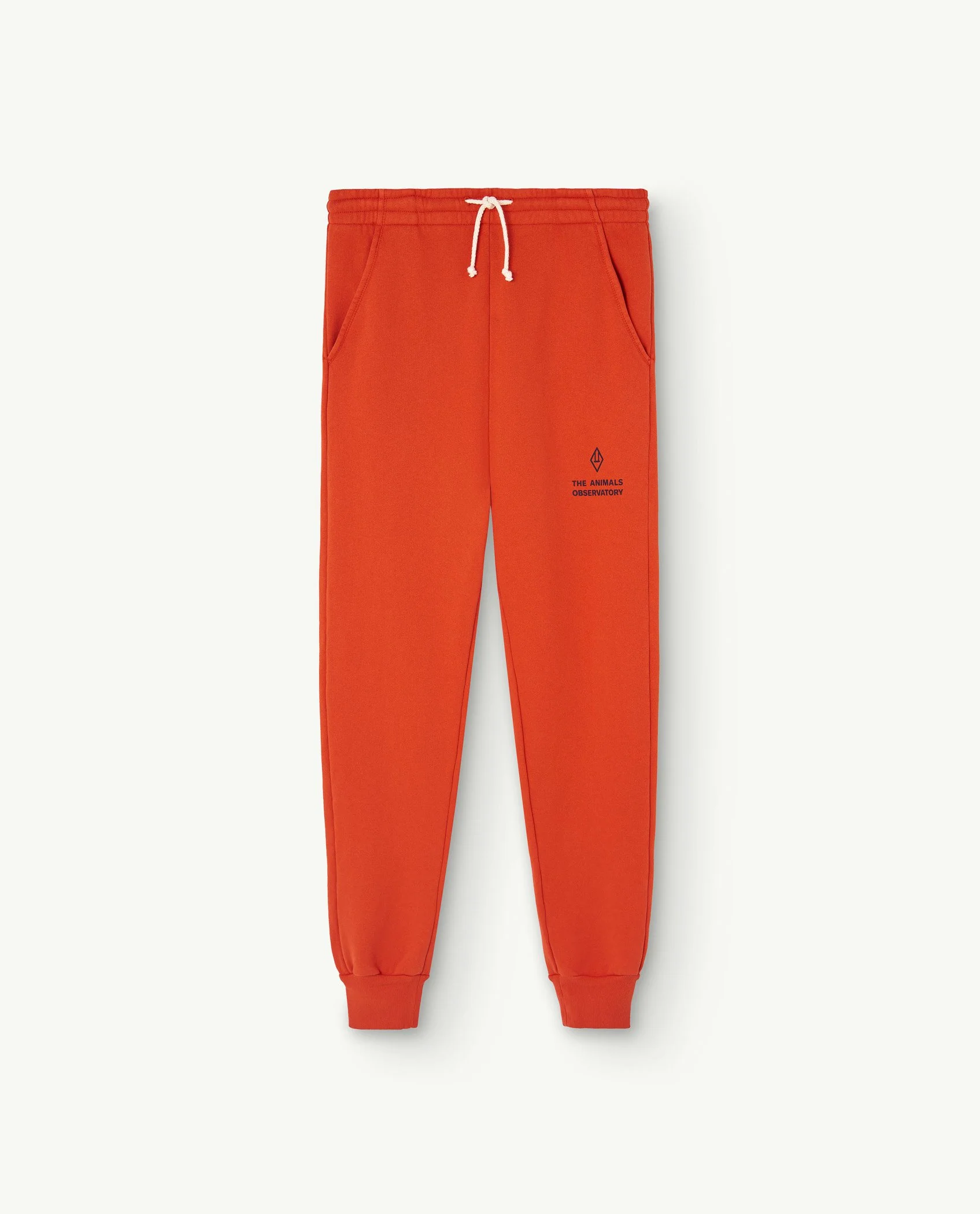 Damskie spodnie dresowe od marki The Animals Observatory w kolorze czerwonym z grantowym napisem marki przy kieszeni.